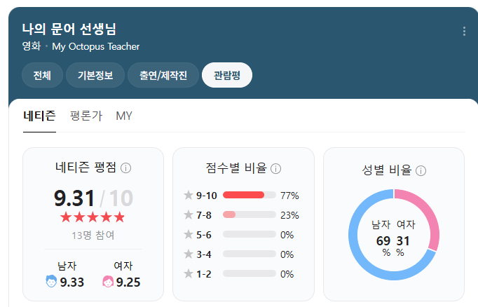 《마이 옥토퍼스 티처》는 바닷속 문어와 다큐멘터리 감독의 교감 속에서 자연의 치유력을 느낄 수 있는 작품입니다.