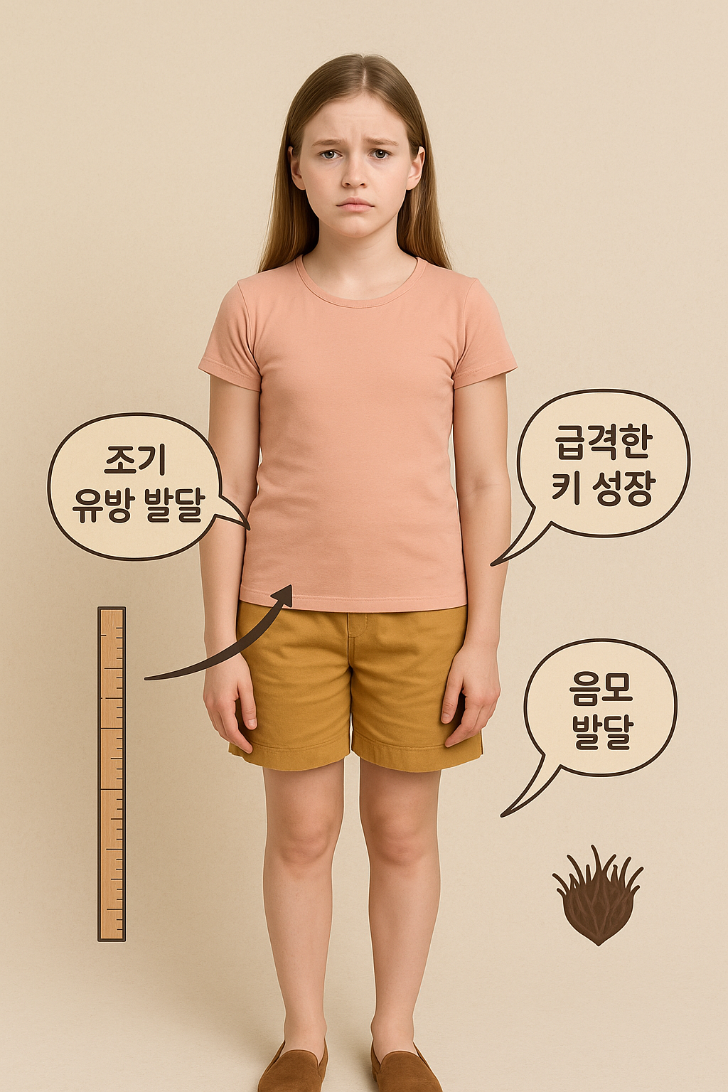 - 초기 신호: 여아 유방 발달, 남아 고환 용적 증가, 갑작스러운 성장 가속, 체취 변화·겨드랑이/음모 발달, 여아의 경우 조기 월경